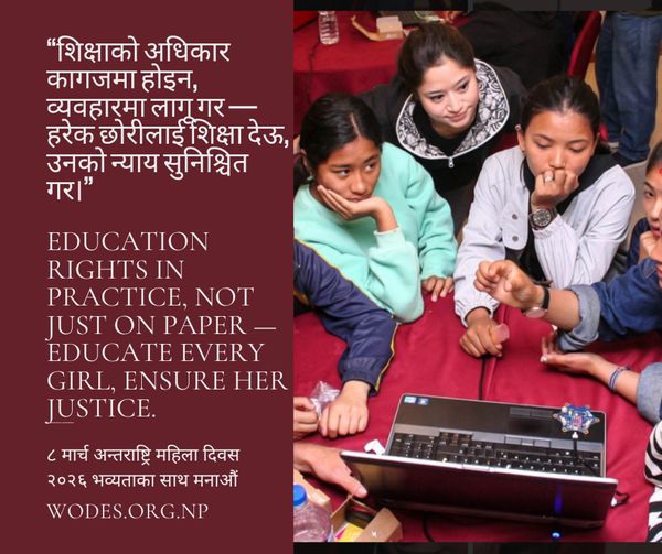 Women Development Society (WODES) ८ मार्च अन्तराष्ट्रि महिला दिवस २०२६ भव्यताका साथ मनाऔंअन्तर्राष्ट्रिय महिला दिवसको उपलक्ष्यमा संयुक्त राष्ट्र संघले “अधिकार, न्याय, कार्य; सबै महिला र छोरीहरूका लागि" को नारा तय गरेकोछ । त्यसको ...