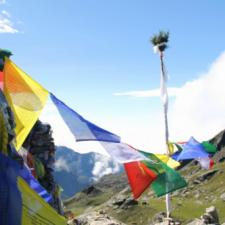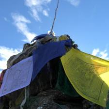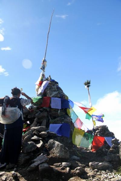 Lauribina Passpeople offering prayer flag at the top of the Lauribina pass