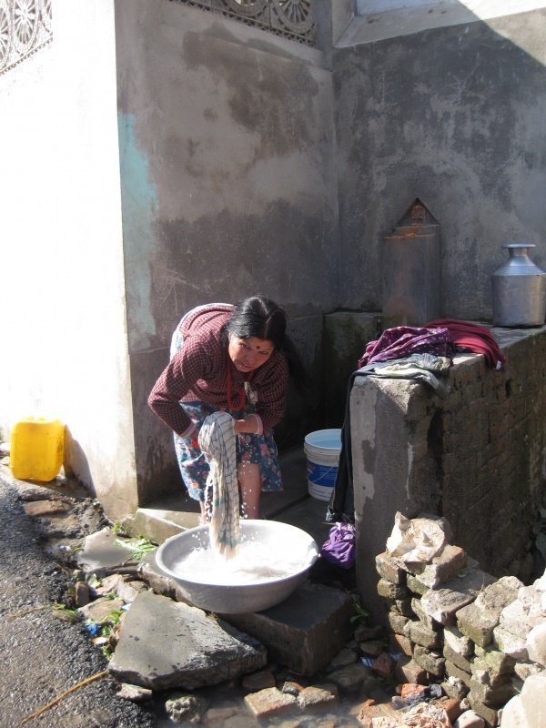 A woman hand washing her clothes next to the road.