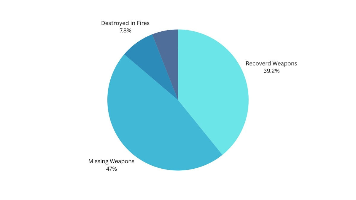 Figure 4: A chart illustrating the percentage breakdown of weapons that are missing, recovered, destroyed, and whose status is unknown