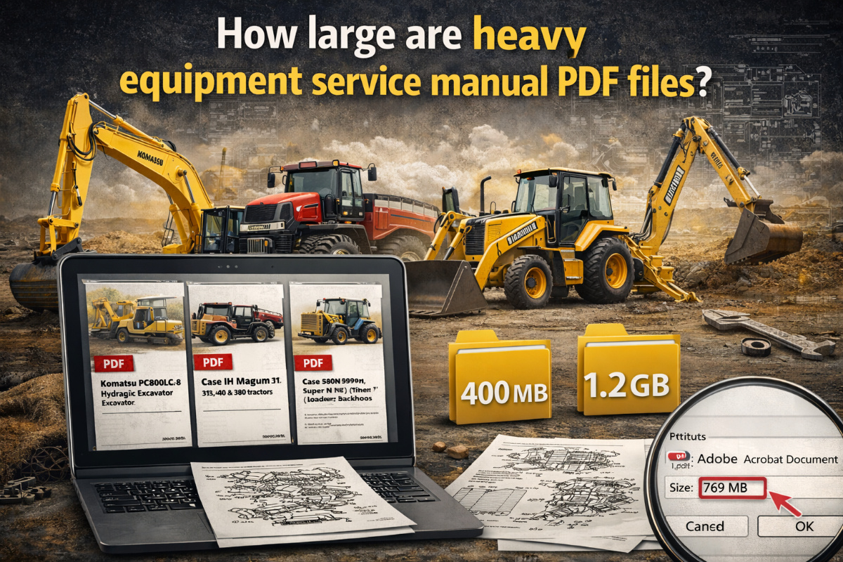 Are you a heavy equipment mechanic, owner, or enthusiast curious about how large heavy equipment service manual PDF files are? These essential resources, providing detailed repair instructions, parts catalogs, and diagrams for brands like Caterpillar, John Deere, Komatsu, and Volvo, vary significantly in size depending on content complexity, page count, and image quality. Typical heavy equipment service manual PDF files range from 10 MB to over 300 MB, with some comprehensive manuals exceeding 500 MB for models with extensive schematics and troubleshooting sections. Understanding file sizes helps in managing downloads, storage, and printing for efficient use in workshops or on-site repairs. This guide breaks down the factors, ranges, and tips in a question-and-answer format, ensuring you can handle these files effectively while promoting reliable sources for your needs.